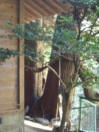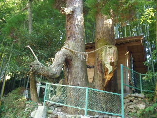 夫婦杉を裏から見ると、左右対称に昇り龍のように伸びていた枝が台風で折れて跡形しかありませんが、境内縁の岩場で長年の風雪、また、ダムが出来る前の川の増水で根元を洗われていたにもかかわらずこのように威勢よく聳える姿に驚嘆するとともに生命力の強さ、それを支える場のエネルギーを覚えます。