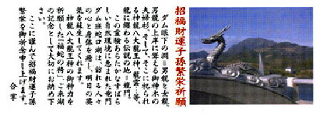 蛇は昔から幸運や金運をもたらす生き物として扱われてきました。その蛇の抜け殻を龍のうろこに見立ててお守りにしたものが「福蛇の袴」です。龍門はその名のとおり龍に携わる伝説があり、竜門ダムの近くには、むかし「雄龍」と「雌龍」が棲んでいたといわれる「男龍」と「女龍」の二つの淵があります。その男龍の上岸には御神木の夫婦杉がそびえ、そこに祭られる「神龍八大龍王神社」にこの「福蛇の袴」をお供えし、竜門ダム班蛇口湖に訪れる人々をはじめ、ご縁のある方々のご多幸を祈願し御守りにしました。この「福蛇の袴」を身に着けていただければ皆様にも幸運が訪れることでしょう。
