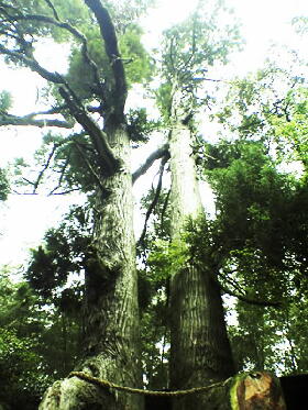 神社がある菊池市龍門地域はその名のとおり龍に携わる伝説があります。竜門ダムの近くには、むかし「雄龍」と「雌龍」が棲んでいたといわれる男龍と女龍の二つの淵があり、その男龍の上岸には伝説の夫婦杉=ご神木が見事にそびえています。(左)